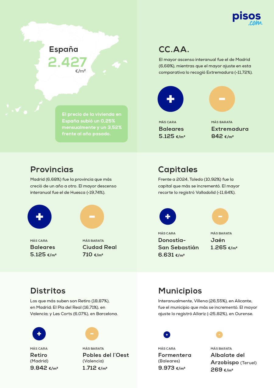 Las mayores subidas frente a 2024 se dieron en Villena (26,55%), en Alicante; Arnedo (25,85%), en La Rioja; y Trujillo (25,80%), en Cáceres. Los que más vieron decrecer su precio medio fueron Allariz (-25,82%), en Ourense; Moguer (-24,71%), en Huelva; y Toro (-24,24%), en Zamora. Ordenando los municipios por precio, se colocaron en los primeros puestos Formentera (9.973 €/m²), Santa Eulàlia Des Riu (9.045 €/m²) y Sant Josep de Sa Talaia (7.850 €/m²), todos ellos en Baleares. La parte baja del listado la encabezaron Albalate del Arzobispo (269 €/m²), en Teruel; Tamarite de Litera (368 €/m²), en Huesca; y Las Pedroñeras (400 €/m²), en Cuenca.