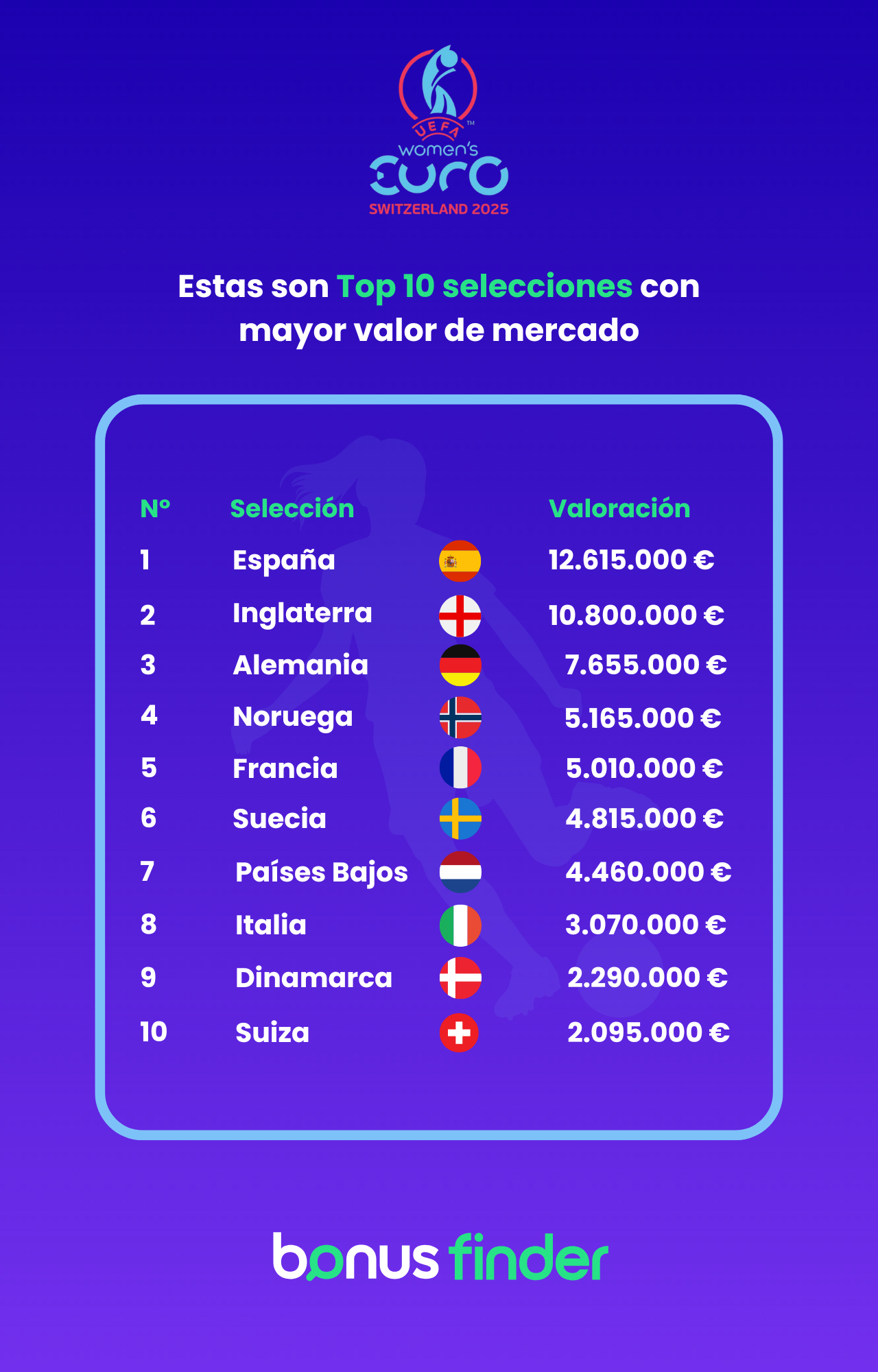 Según el estudio realizado por BonusFinder, la selección española lidera la Eurocopa femenina 2025 con la selección más valiosa y Aitana Bonmatí como la jugadora mejor valorada del torneo. Con una valoración de 12,6 millones de euros, España encabeza el ranking económico de selecciones y domina el top 10 de jugadoras más cotizadas del campeonato